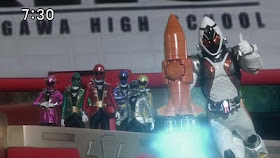 Luckily though Gen jumps in and saves Tomoko as she gets away and Gen transforms. The two witches attack him at first, but Shun in the Power Dizer and the rest of the gang catches them and gets their pendants. Fourze goes into Elek States, but Gen still has isssues fighter her because of her fire. Ritsuko sends her rod to the roof to complete the ritual, but Shun gets the rod before it hits the school and breaks it. Next Gen uses Fire States and tries to block the fire with the shield switch. Tomoko though tells Gen to not use the shield. Now Gen just takes the fire attacks and it seems that because of Gen potential the Fire switch is absorbing the fire for power. Gen then finishes off the Zodiart with Rider Erupting Shot! Next morning Gen, Yuki, and now Tomoko run as Tomoko and Genta get to a river or lake. Yuki says that Tomoko is a member of the team and even Kengo is fine with Tomoko because she has an unused Zodiart Switch. Sadly though Tomoko threw the switch into the water becuase she wants a fresh start. Kengo gets mad and shoves Gen, but also gets Tomoko by accident as they fall into the water.